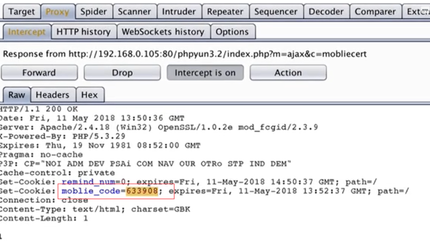 由于短信发送接口大多数都采用AJAX架构涉及,发送成功时用户界面正常只能看到“发送成功”的字样,并不会把验证码信息显示出来(正经人谁抓包),所以此时攻击者就可以抓包直接获取短信验证码。